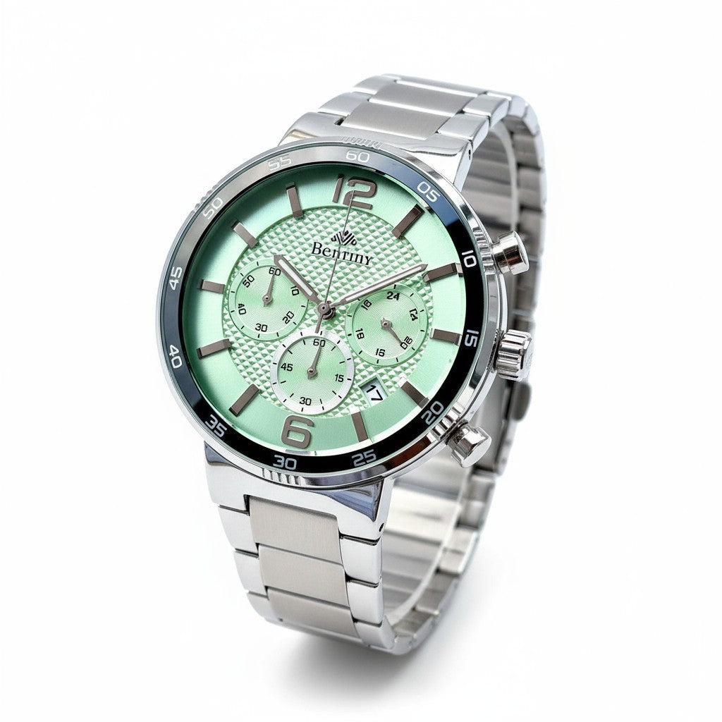 AuroraTime ile tarzınızı bir üst seviyeye taşıyın. Çarpıcı yeşil kadranı ve şık siyah kasasıyla her ortamda dikkatleri üzerinize çekin. Hem resmi hem de günlük kullanım için ideal, hassas zaman işleyişiyle daima bir adım önde olun.